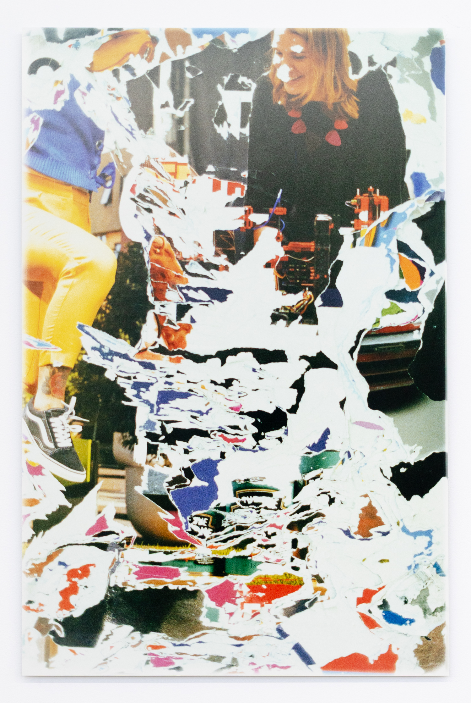 From apocalyptic landscapes to ravaged portraits to abject abstraction: this third category is evident in the trilogy of “2017, Flinders Street Station, Melbourne, Victoria, Australia” (“I”, “II” and “III”). Their vertical dimension suggests shop windows or bedroom mirrors—both in which one catches sight of oneself in moments of private analysis—but here the Self is obliterated. Their intense peeling, scratching, striating and tearing evoked a de Kooning-like destruction of all recognizable form. The opposite of the growth rings of exposed tree trunks, the dense inter-layering of pasted paper shards implies a depth of temporality without disclosing any contents. Fragments of smiling faces, yellow Capri pants, mysterious circle charts and tinned bake beans compress Surrealist impact, aleatory excitation and image overload.