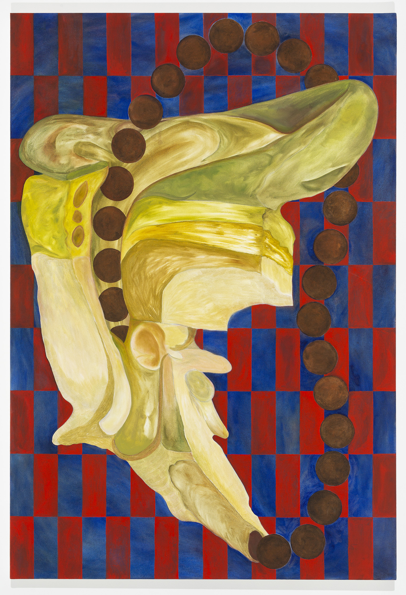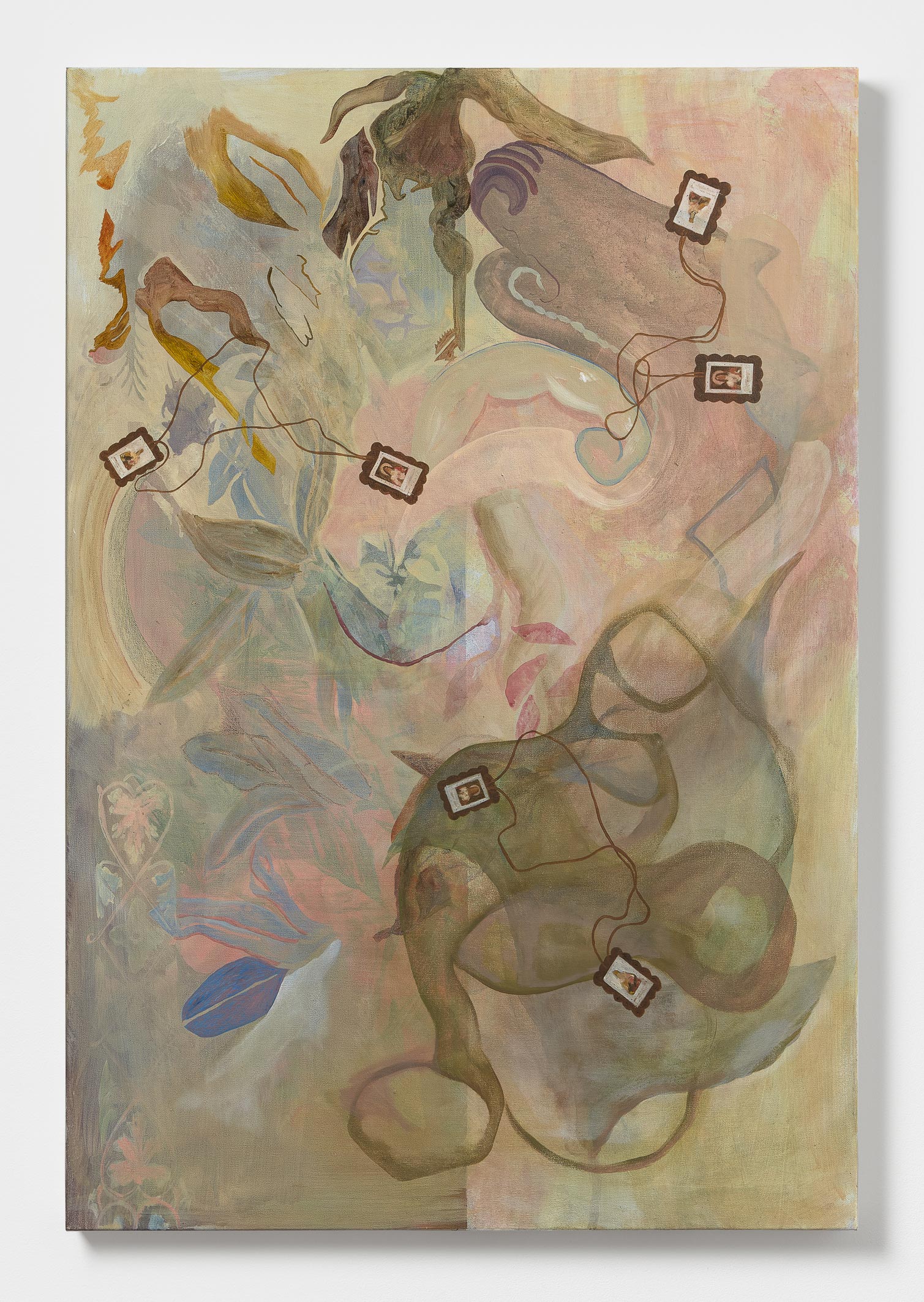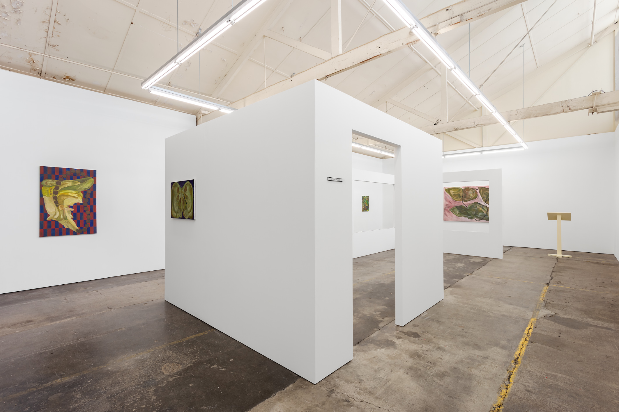 Green Seeks Little Attention is a solo exhibition by David Egan for Haydens, which presents new paintings alongside existing works from the past four years. The exhibition is punctuated by a series of short texts by the artist and writer Aodhan Madden. Central to the exhibition is a reconfigured version of Crying Room (2019), a recent installation which approximates a church’s crying room—the segregated viewing chamber which quarantines leaky parishioners (crying children, mourners, overwhelmed believers), whilst still allowing for remote participation in church ritual. For the presentation at Haydens, the walls of Crying Room are shuffled apart, made to be open-plan—an impotent room. This sense of things losing their edges—breaking down into pieces, becoming fragmented—permeates the exhibition. Burrowing weeds open cracks in foundations, bodies are exploded into chains of cells, colours mystically flicker and blend.