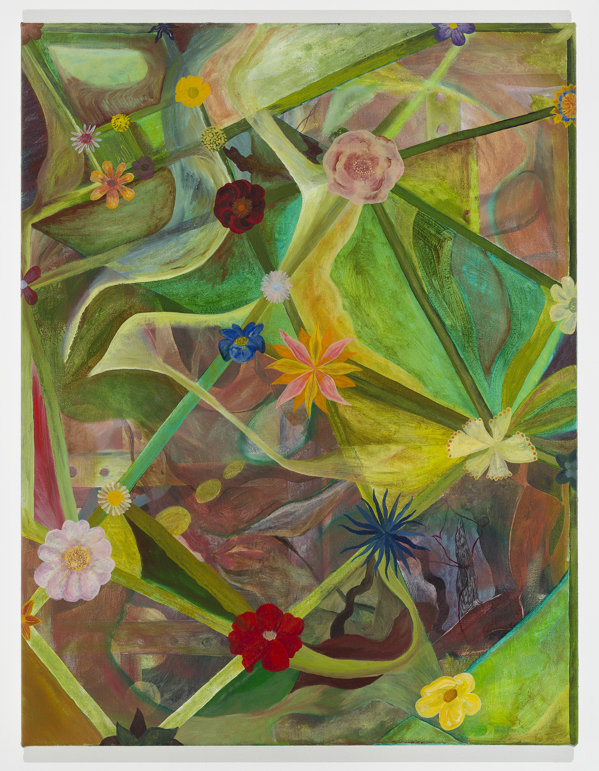 Each painting in the exhibition is a painting of a flower in some way. A flower might signify just about anything at all besides a flower. The language of flowers: coded colours, wilting innuendo. One flower cowers on a bench. It’s being told off, or it feels guilty about something. It clears its throat, but it can’t speak, it’s a flower. It just sits on the bench feeling sorry for itself, embarrassed by all the innuendo and the garish colours. Bunches of colour are everywhere. Red sweeps the floor, the walls are yellowing, the flowers feel blue, and green is evasive. Some flowers are like cabbage ears, unfurling to hear the florist gossip. Some flowers purport to be angels pedalling passage between the worlds. Some flowers are thirsty, and others are cagey. Green seeks little attention. A little, maybe.